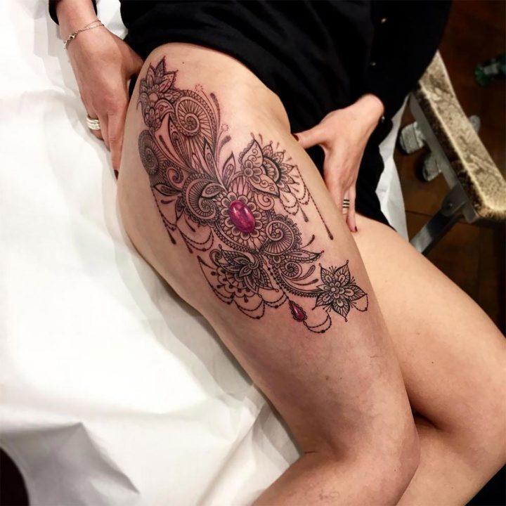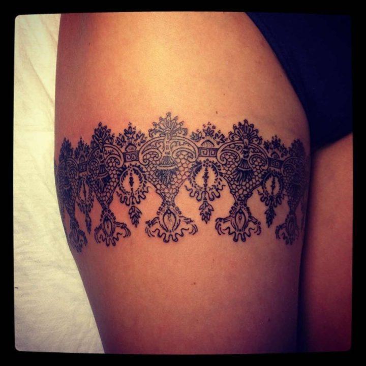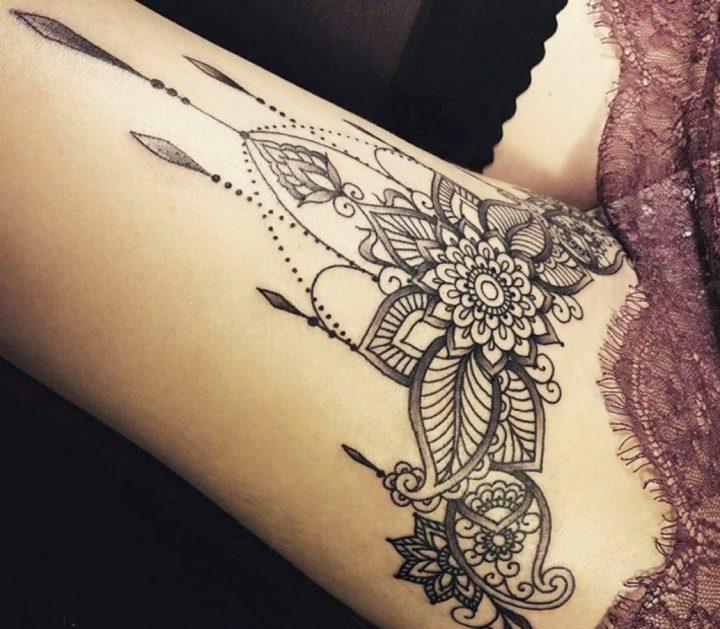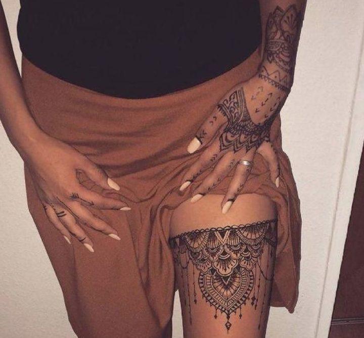 Sur la cuisse, les filles font souvent un motif de gaine, qui est une très belle imitation d'un haut de bas. Mais il existe aussi d'autres motifs qui peuvent orner une partie de votre cuisse de manière très complexe.