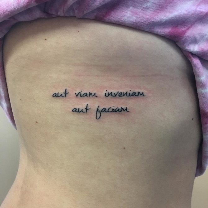 Pour les lettres latines sur le corps, l'essentiel est la charge sémantique. Seul un long choix de phrases significatives mènera au succès. L'expression peut être motivante, rappeler des moments significatifs, des objectifs de vie et des priorités, mais elle ne doit pas vous ennuyer. En perçant votre corps, vous révélez au monde une partie de votre âme et de vos valeurs morales.