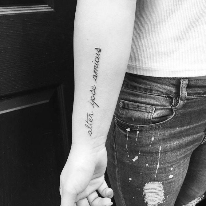 La priorité de nombreuses personnes dans la vie est l'amour et la famille. Vous pouvez faire imprimer sur votre corps, en latin, les noms de vos proches (enfants, conjoint), vos vœux de mariage et de beaux aphorismes. Parmi eux, les plus populaires sont :