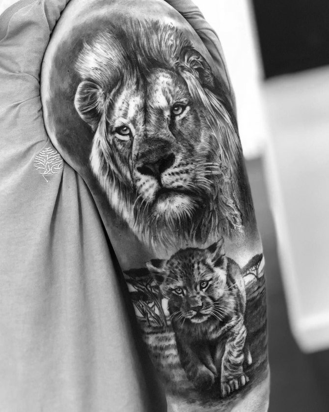 Tatouage d'un lion (une sélection de tatouages de lions) Le lion symbolise la noblesse, la bravoure, la fierté et la majesté royale. Le lion est considéré comme le patron de tous les animaux et associé aux dieux du soleil. Le tatouage du lion est un choix de personnes fortes, volontaires, avec des qualités de leadership évidentes.