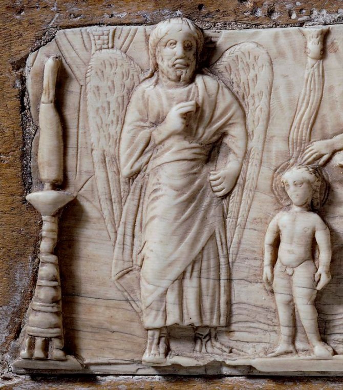 Στον πέμπτο αιώνα συναντά κανείς ακόμη ασυνήθιστα έργα τέχνης στα οποία αναμειγνύονται παλαιοί και νέοι κανόνες. Για παράδειγμα, σε έναν ιταλικό πίνακα από ελεφαντόδοντο που φυλάσσεται στο Βρετανικό Μουσείο του Λονδίνου, βλέπουμε έναν ουράνιο αγγελιοφόρο με τήβεννο με φτερά, πηχτή γενειάδα και μουστάκι, να ευλογεί τη βάπτιση του Ιησού. Στο μέλλον, ωστόσο, οι άγγελοι δεν θα φαίνονται ποτέ ξανά τόσο ανδροπρεπείς.