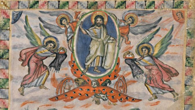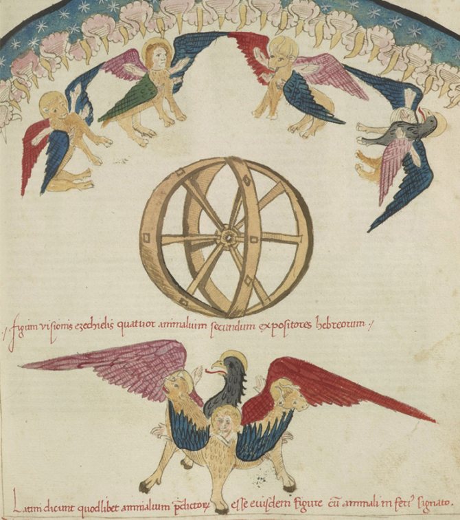 Για το λόγο αυτό, οι σελίδες των μεσαιωνικών Βιβλίων περιέχουν συχνά απεικονίσεις πλασμάτων με κεφάλια ανθρώπου, ταύρου, λιονταριού και αετού. Στο σώμα τους, τα πόδια τους αντιπαραβάλλονται με πατούσες ή ρόδες, διάστικτα με μάτια και τα χέρια τους με φτερά.