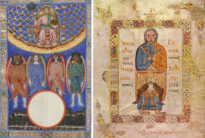 Για παράδειγμα, στη γενικευμένη εικόνα των Ευαγγελιστών βλέπουμε ζωομορφικά μοτίβα: ο γενειοφόρος άνδρας έχει ένα ζευγάρι ανθρώπινα πόδια, φορώντας σανδάλια, αλλά μπροστά, σαν πίσω από ένα παραβάν, κρέμονται πόδια αετών και λιονταριών και οπλές ταύρων.