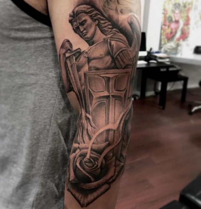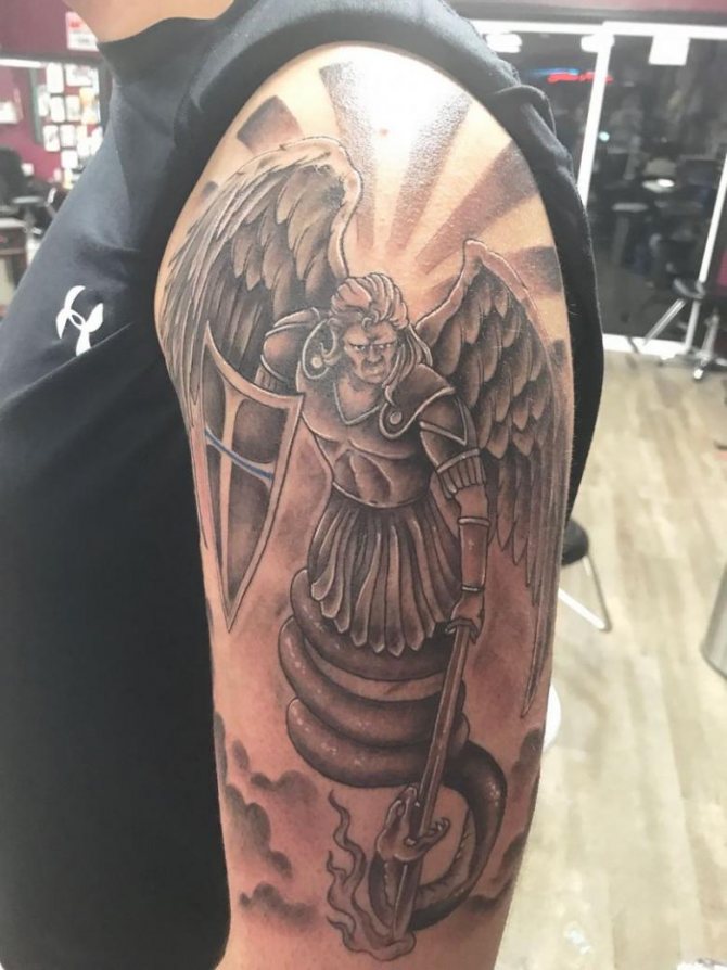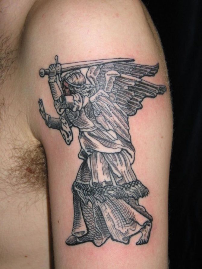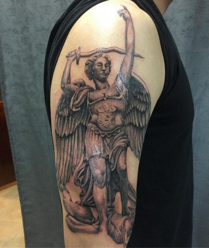 Το τατουάζ με τη μορφή αρχάγγελου λέει για την επιθυμία να απαλλαγούν από τα ελαττώματα και τα πάθη τους. Επιπλέον, μια τέτοια εικόνα σώματος μπορεί να σημαίνει ότι ο εκπρόσωπος του ισχυρότερου φύλου πιστεύει ειλικρινά ότι θα βοηθήσει σίγουρα ανώτερες δυνάμεις.