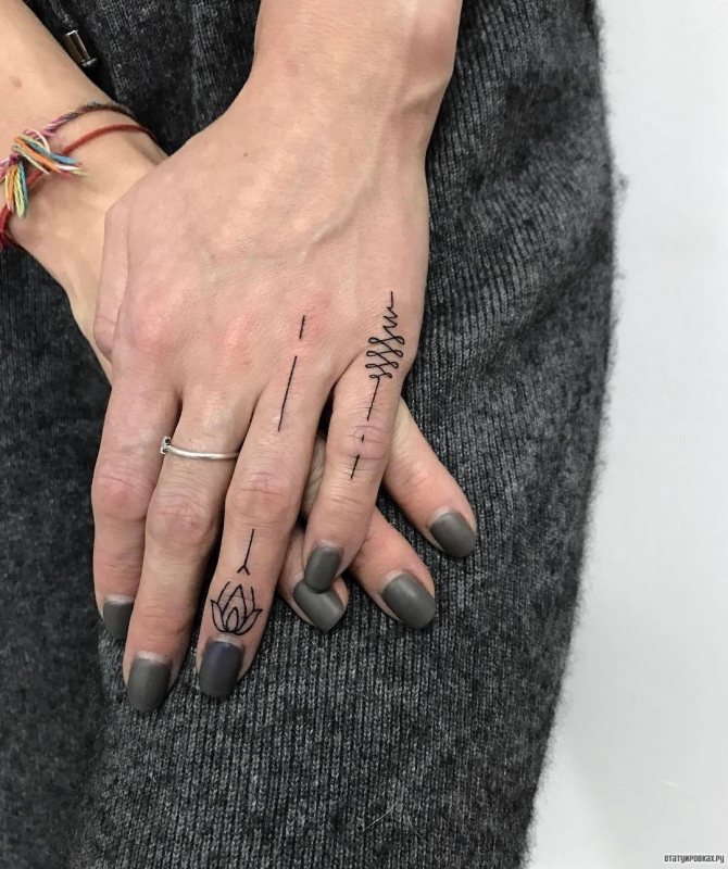 Το σκίτσο που επιλέγει μια κοπέλα και σχεδιάζεται στα δάχτυλά της έχει ένα συγκεκριμένο νόημα, ανάλογα με το αν είναι στο μικρό δάχτυλο του χεριού ή στο δάχτυλο του δαχτυλιδιού. Για τα κορίτσια, οι καλύτερες επιλογές για τατουάζ είναι χρωματιστά ή μινιμαλιστικά μαύρα, αλλά όχι βαριά, με ασαφή σύμβολα. Μπορείτε να ζωγραφίσετε λουλούδια, ζώα, κάποια σύμβολα ή ακόμη και να γράψετε το όνομά σας.