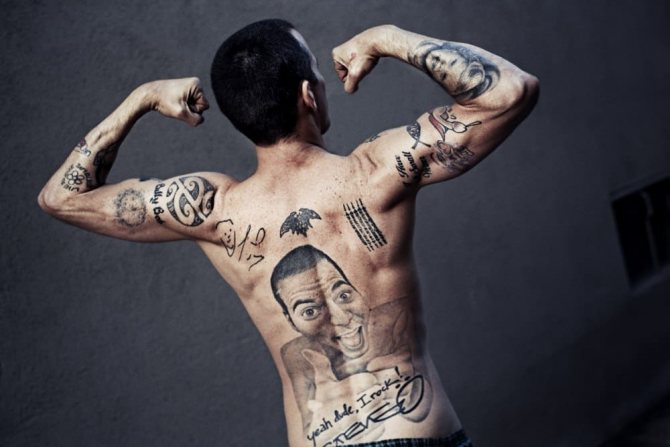 Ο ράπερ Guf (Alexey Dolmatov), μεγάλος οπαδός των τατουάζ, αποτύπωσε την αγάπη του για τη Μόσχα με ένα πανόραμα της πρωτεύουσας στην πλάτη του (μπορείτε να δείτε όλα τα τατουάζ του Guf εδώ).