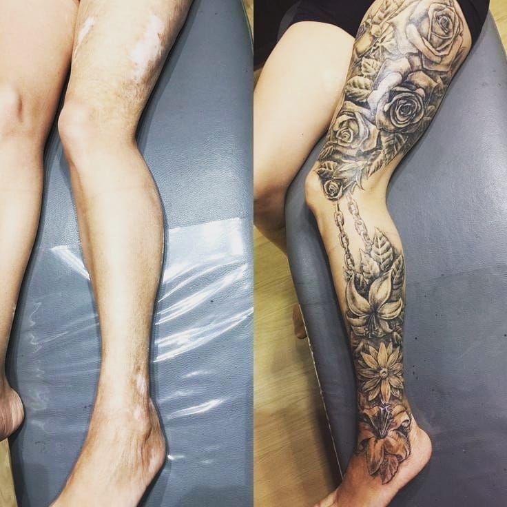 Πέσατε από το ποδήλατό σας όταν ήσασταν παιδί; Να τσακωθείς με τα αγόρια στην αυλή της διπλανής πόρτας; Η ιστορία των ουλών σας θα μπορούσε να είναι οτιδήποτε. Τα λευκά σημάδια στα γόνατά σας που δεν μπορούν να αφαιρεθούν με αλοιφές και είναι μάλλον προβληματικό να αφαιρεθούν με λέιζερ μπορούν εύκολα να συγκαλυφθούν με ένα λευκό τατουάζ. Μια τέτοια εργασία φαίνεται εκπληκτικά λεπτή και εντελώς διακριτική.