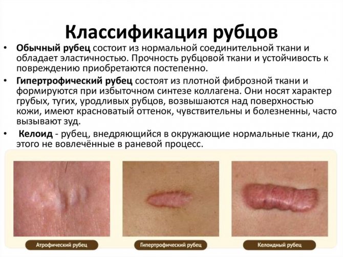 Τύποι ουλών: α - ατροφικές, β - νορμοτροφικές, γ - υπερτροφικές.
