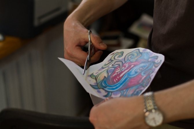 Το περίγραμμα κόβεται. Για να προσαρμοστεί η εικόνα τέλεια στο δέρμα και να ακολουθήσει όλες τις καμπύλες του, γίνονται περικοπές κατά μήκος των άκρων του χαρτιού.