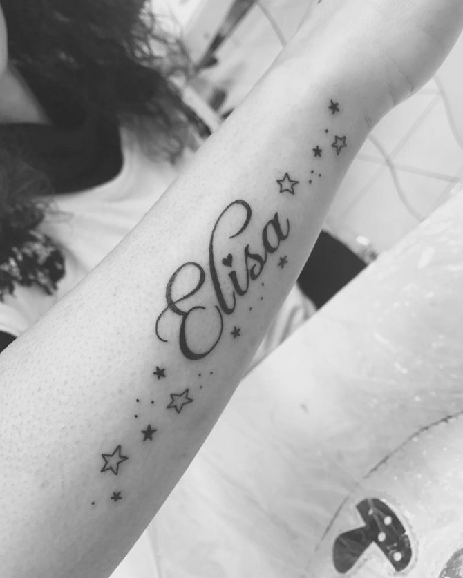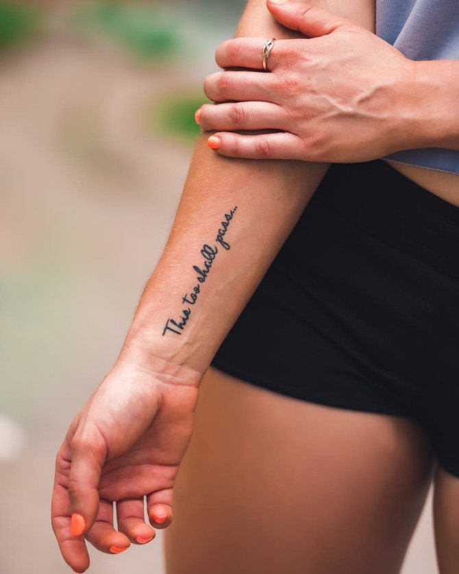 - Επιγραφές: ατάκες, όρκοι, επετείους ή μότο της ζωής, πολύ σχετικό τατουάζ στον καρπό για τα κορίτσια, που εφαρμόζονται στα λατινικά ή σε μια ξένη γλώσσα, φράσεις στα ρωσικά είναι λιγότερο δημοφιλείς και χρησιμοποιούνται μόνο για να "διαιωνίσουν" τα ονόματα ή τα αρχικά του αγαπημένου σας,