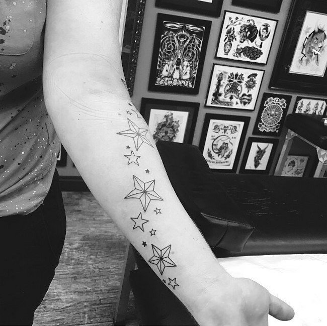 - Αστέρια: αυτά χρησιμοποιούνται πιο συχνά σε διασκορπισμούς, αλλά είναι επίσης δυνατοί αστερισμοί ή ουράνια σώματα που πετούν- παρεμπιπτόντως, ένα απλό αστέρι τοποθετημένο πίσω από τον καρπό λέγεται ότι υποδηλώνει μια γυναίκα με έφεση στον έρωτα του ίδιου φύλου,