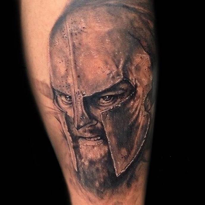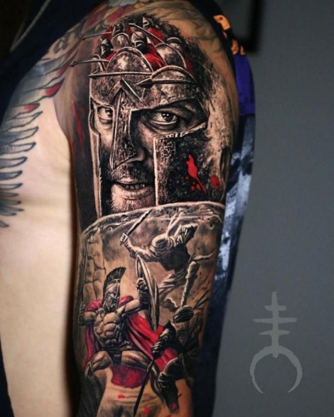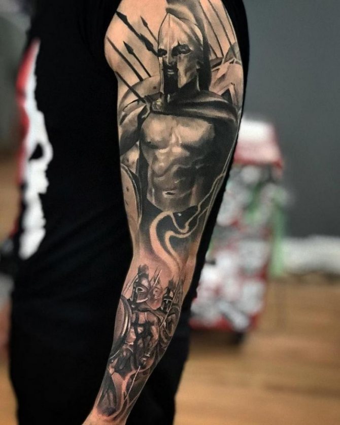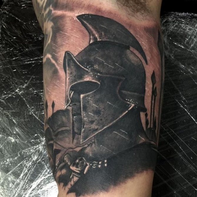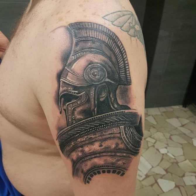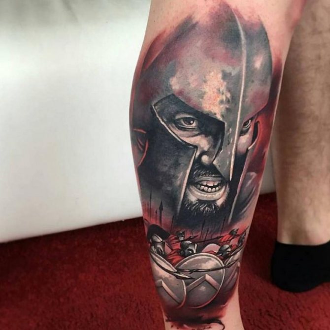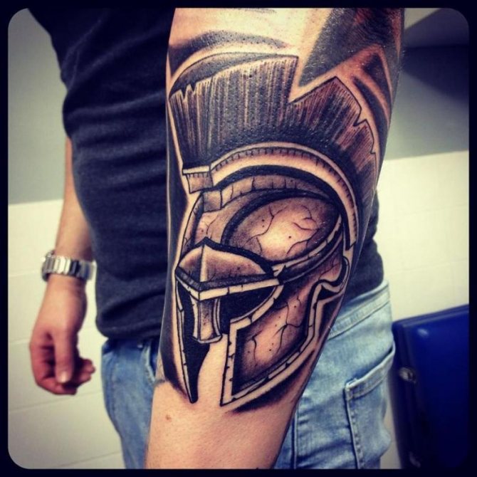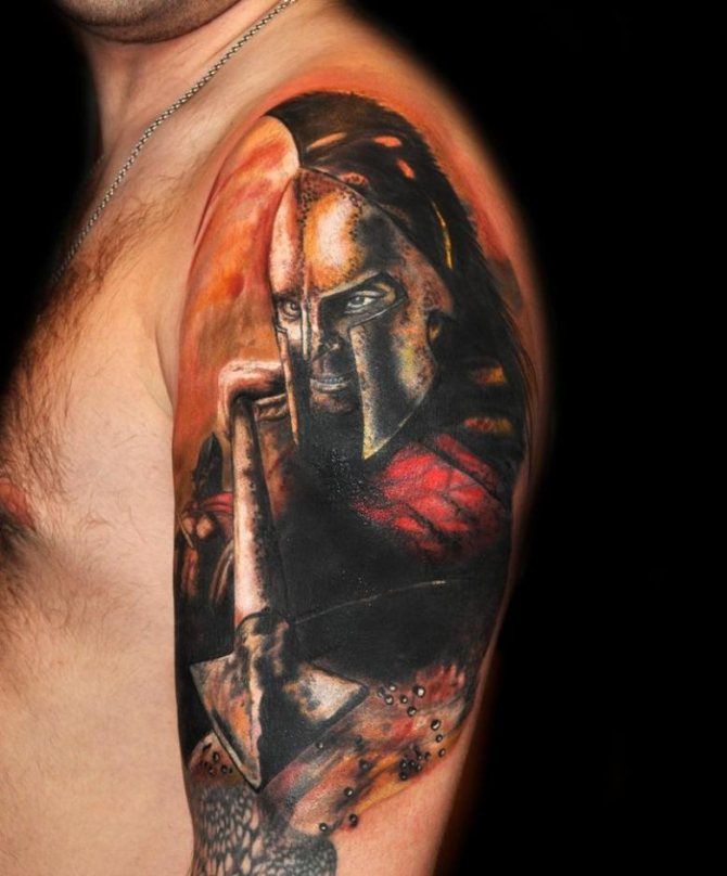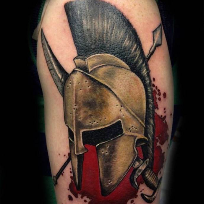 Έτσι, "Σπαρτιάτης" - ένα τατουάζ που υποδηλώνει τις ιδιότητες που ενυπάρχουν στον αληθινό πολεμιστή και τον ατρόμητο μαχητή. Οι άνδρες κάνουν τατουάζ στους ήρωες σε μήκος μέσης, σε όλο το μήκος ή μόνο στο κεφάλι. Υπάρχει επίσης η εικόνα ενός κράνους. Δεν υπάρχει ιδιαίτερη διαφορά στη σημασία σε αυτή την περίπτωση. Εξάλλου, το κράνος είναι βασικό χαρακτηριστικό κάθε πολεμιστή, μια εμβληματική στολή, προστασία στη μάχη. Δεν είναι ασυνήθιστο να βλέπουμε μορφές ασπίδων διαφόρων μορφών, κέλτικα σύμβολα, σπαθιά και δόρατα. Μερικές φορές το τατουάζ συνοδεύεται από την επιγραφή "πολεμιστής", "θάρρος", "γενναιότητα", "ελευθερία", "ποτέ δεν παραδινόμαστε" στα λατινικά ή στα αγγλικά.