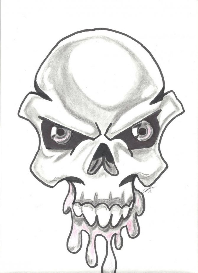 Για να προσθέσετε τέχνη στο σχέδιο είναι απαραίτητο να σφραγίσετε κάποιες γραμμές. Μετά από μια σειρά από απλές λειτουργίες που είναι απαραίτητες για να συμπεράνουμε γύρω από την τελική μύτη και τις κόγχες των ματιών γραμμές κρανίο. Στο κάτω μέρος της σιαγόνας εξόδου με δόντια. Τα δόντια δεν πρέπει να είναι συμμετρικά μεταξύ τους. Οι ανομοιόμορφες γραμμές των δοντιών προσδίδουν καλλιτεχνικότητα στο σχέδιο.