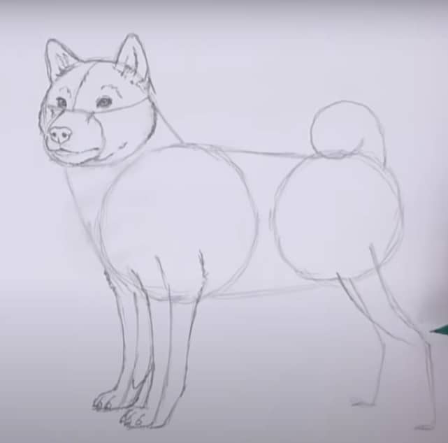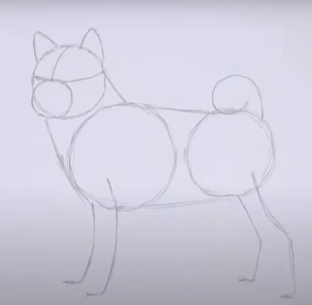 4. Συνδέοντας τις γραμμές σε κύκλο, παρατηρούμε τώρα πώς σχηματίζεται ο λαιμός και ο χαριτωμένος κορμός. Πώς να σχεδιάσετε ένα σκύλο με μολύβι είναι πλέον σαφές. Μπορείτε να αναπαραστήσετε οποιαδήποτε φυλή με παρόμοιο σχέδιο. Προσθέτουμε το χαρακτηριστικό γνώρισμα της φυλής Σίμπα Ίνου - μια στρογγυλή ουρά.