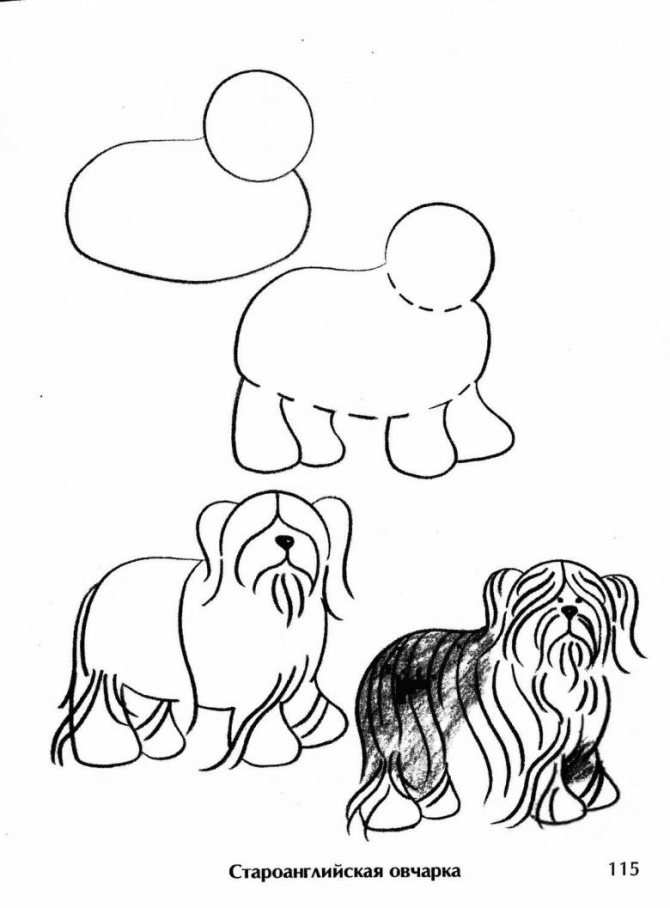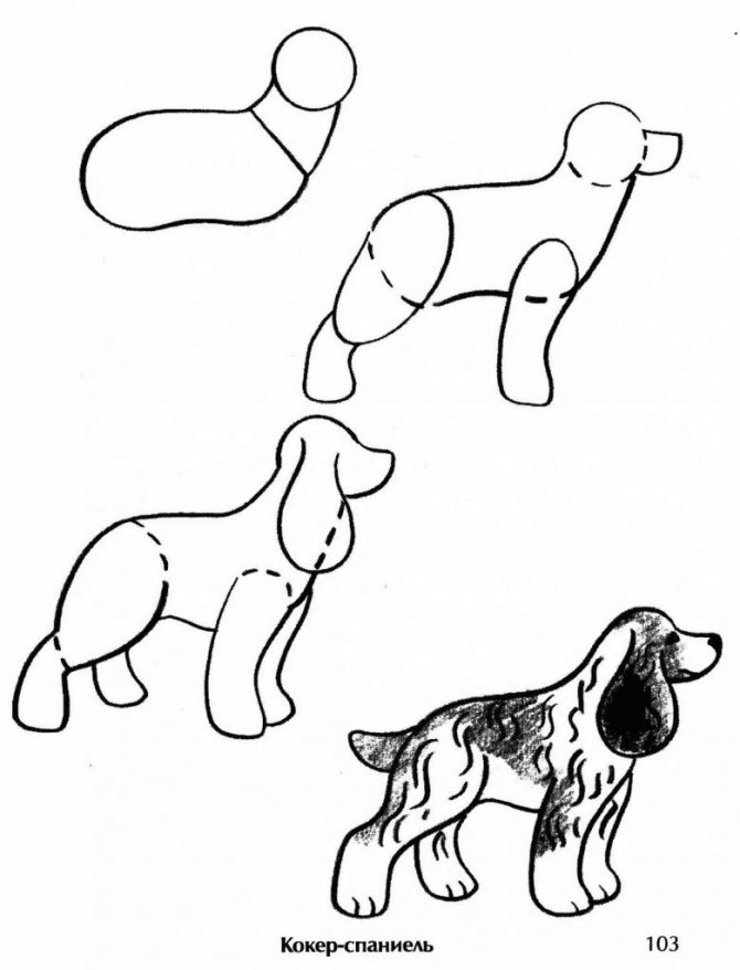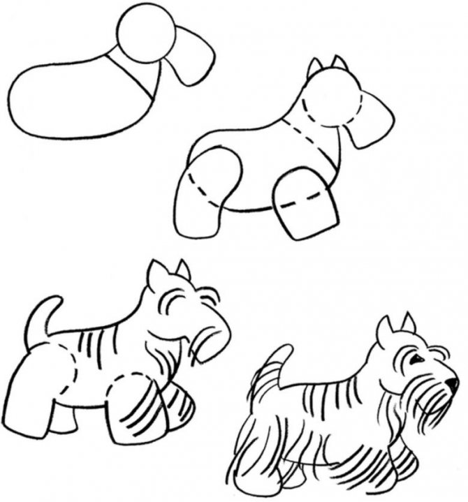 Δεδομένου ότι ο σκύλος είναι αρκετά λεπτός, μπορούμε να σχεδιάσουμε έναν μεγαλύτερο, σχεδόν κανονικού μεγέθους σκύλο χωρίς να διαταράξουμε τη συνθετική ισορροπία. Ο σκύλος στέκεται στα τεντωμένα πόδια και κοιτάζει μπροστά του. Σχεδιάστε τα περιγράμματα του κορμού και των ποδιών, καθώς και του λαιμού και του κεφαλιού. Το στήθος είναι δυνατό, η κοιλιά αδύνατη. Ο λαιμός είναι μάλλον μακρύς και περήφανα όρθιος. Μπροστινά πόδια όρθια, πίσω πόδια κάπως πίσω.