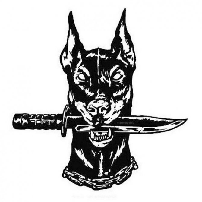 Το τατουάζ με το χαμογελαστό πρόσωπο ενός ντόμπερμαν προσδιορίζει τέλεια τον κάτοχό του ως γενναίο υπερασπιστή της οικογένειας και των αγαπημένων του προσώπων. Αυτός ο άνθρωπος δεν θα σπαταλήσει ποτέ ενέργεια και ευγλωττία, αλλά την κατάλληλη στιγμή θα ξεδιπλώσει ένα ισχυρό ελατήριο, χτυπώντας σωστά τον δράστη