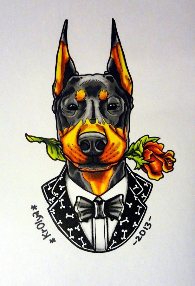 Δηλαδή, ένα είδος χαμογελαστού ρύγχους. Η παρούσα υπόθεση δεν αποτελεί εξαίρεση. Το τατουάζ με το χαμόγελο του Ντόμπερμαν, όπως και στην περίπτωση του πίτμπουλ, προκαλεί φόβο, κίνδυνο και άγχος. Συχνά ο κάτοχος ενός τέτοιου τατουάζ αποκτά πρόσθετη αυτοπεποίθηση, ένα είδος δύναμης και θάρρους. Εκτός από το χαμόγελο, θα δείτε φωτογραφίες από το κεφάλι ενός ντόμπερμαν με ήρεμα και ψύχραιμα χαρακτηριστικά στη συλλογή φωτογραφιών μας. Αυτός ο τύπος εικόνας αποπνέει