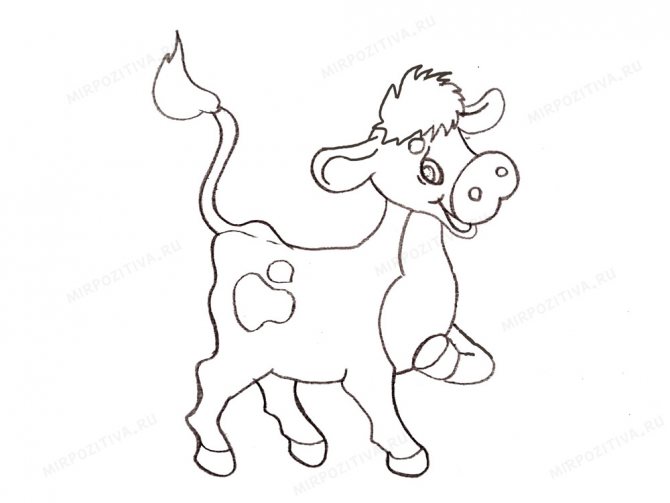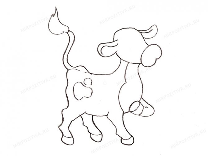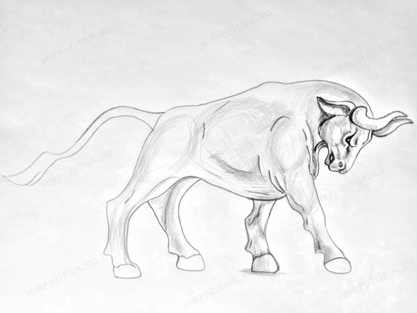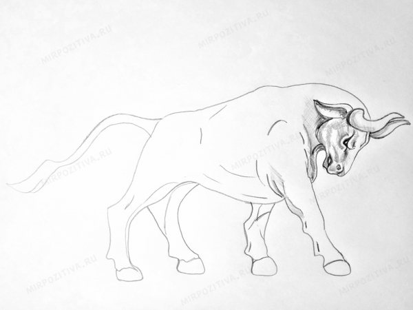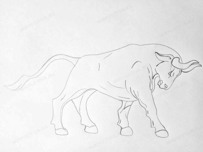 Από το δεξί μάγουλο του ταύρου, σχεδιάστε μια ομαλή γραμμή προς τα αριστερά, που αποτελείται από τρεις καμπύλες: σώμα, μηρός και πόδι. Σημειώστε με δύο γραμμές την οπλή και τραβήξτε μια γραμμή από αυτήν προς τα δεξιά, ολοκληρώνοντας το περίγραμμα του δεξιού ποδιού.