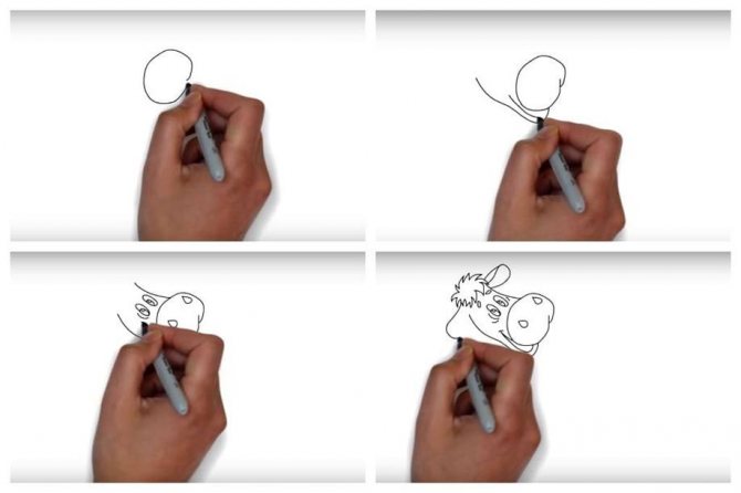 Τραβήξτε τα οβάλ ρουθούνια πιο κοντά στο άνω όριο της μύτης, μέσα στις αγκύλες προσθέστε όγκο. Από την κορυφή του κεφαλιού, σχεδιάστε την αριστερή και τη δεξιά καμπύλη θηλιά των αυτιών, σημειώνοντας τα άνω όριά τους με πινελιές. Πάνω από το κεφάλι, σχεδιάστε ένα σγουρό κτύπημα με μια κυματιστή γραμμή.