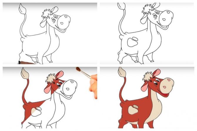 Αυτή η εικόνα έχει όγκο. Όταν κοιτάζετε το τελικό αποτέλεσμα, φαίνεται σαν το ζώο να πρόκειται να βγει από το λεύκωμα. Λίγα βήματα πίσω, είναι σαφές ότι δεν είναι δύσκολο να επαναλάβετε την εικόνα, αλλά είναι σημαντικό να διατηρήσετε τις αναλογίες και να μην ξεχάσετε τις σκιές κατά το χρωματισμό. Είναι αυτοί που θα κάνουν την αγελάδα ρεαλιστική.