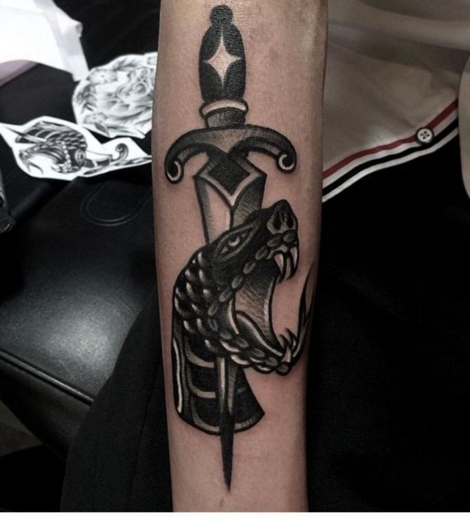 Όταν ένα φίδι περιπλέκεται στη λεπίδα του μαχαιριού, η εικόνα υποδηλώνει ότι το άτομο είναι μέλος του ιατρικού επαγγέλματος. Εάν η εικόνα τοποθετηθεί στο σώμα ενός κρατουμένου, αναδεικνύει έναν κλέφτη του νόμου. Το φίδι είναι επίσης σύμβολο σοφίας και δόλου, οπότε ο κάτοχος του τατουάζ δεν είναι τόσο απλός όσο φαίνεται. Ένα τατουάζ με ένα μαχαίρι και ένα φίδι μπορεί να υποδηλώνει ότι το άτομο ασχολείται με τον αποκρυφισμό.