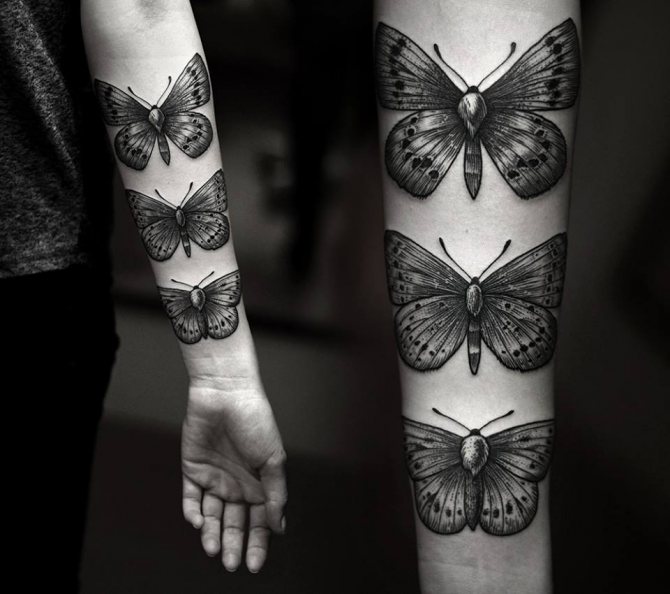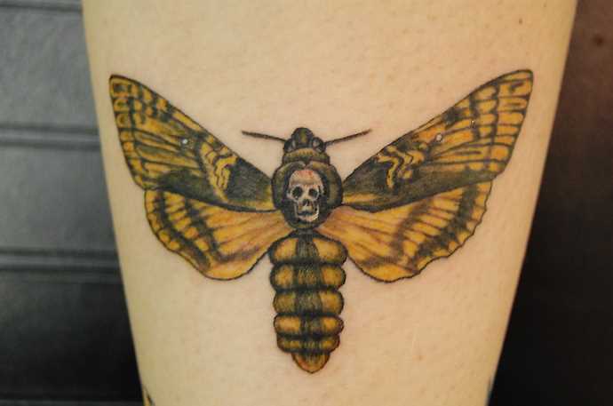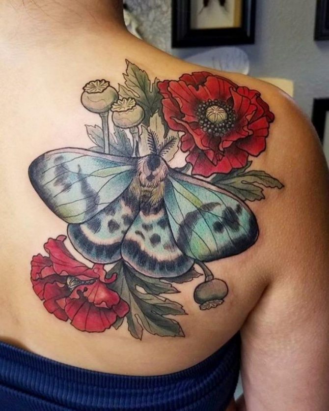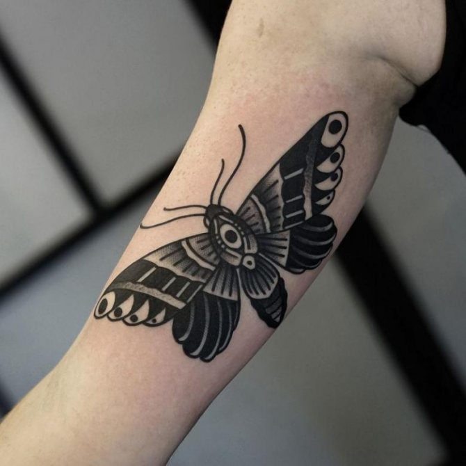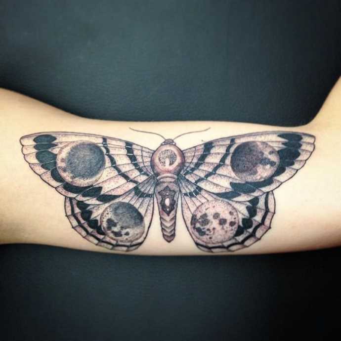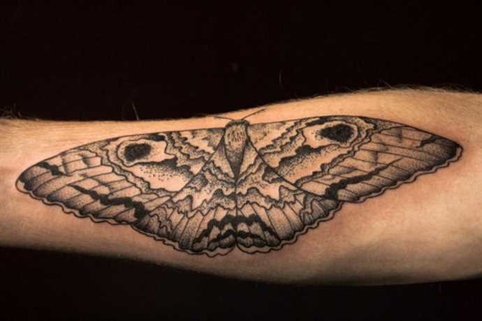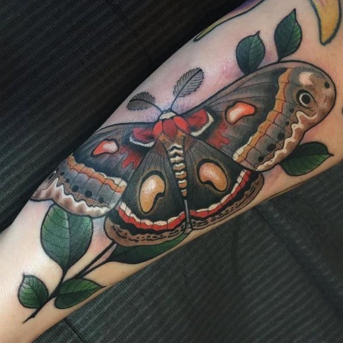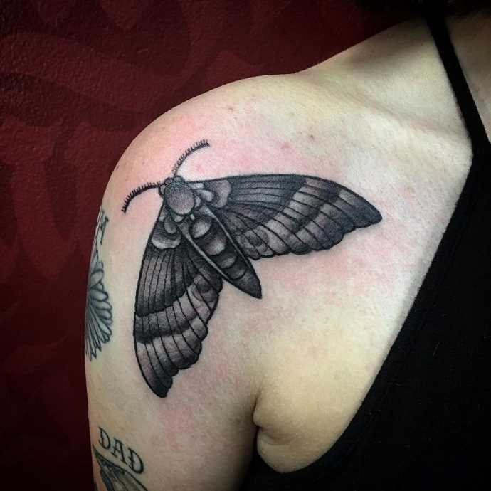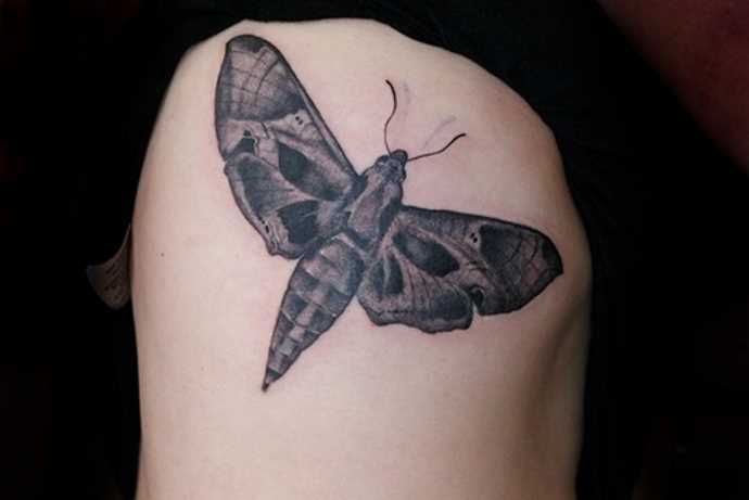 Στους άντρες αρέσει να ζωγραφίζουν ένα σκώρο στον ώμο, την πλάτη ή το χέρι τους. Και οι γυναίκες σχεδιάζουν μια μικρότερη πεταλούδα κάτω από το στήθος, στον καρπό και στην ωμοπλάτη. Πολύ πρωτότυπο τατουάζ στο στυλ του ρεαλισμού. Η ομορφιά των φτερών, τα αστραφτερά χρώματα αποδίδονται από την πολύπλοκη τεχνική του δασκάλου. Φαίνεται ότι το έντομο κάθεται στον ώμο και είναι έτοιμο να πετάξει μακριά.
