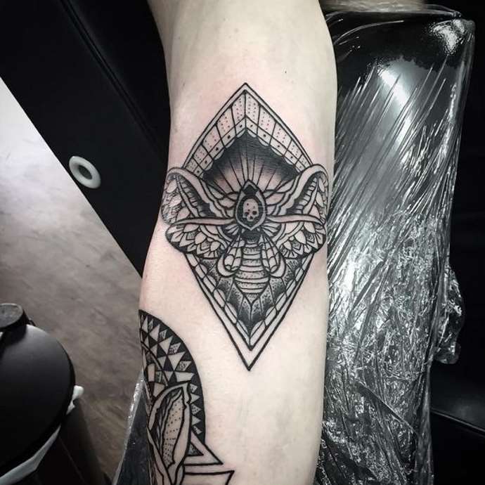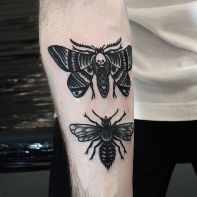 Πολύ αποτελεσματικά φαίνεται ένα τατουάζ με αυτό το φτερωτό έντομο, φτιαγμένο στο στυλ του ρεαλισμού, της παλιάς σχολής, της χάραξης. Τέτοιες τεχνικές είναι δημοφιλείς για την εφαρμογή φωτογραφιών όχι μόνο εντόμων, αλλά και διαφόρων πτηνών και ζώων. Η φυλετική εικόνα είναι πιο κατάλληλη για άνδρες, καθώς το σκίτσο του σκόρου θα δείχνει ωραίο σε χρώμα με πρωτότυπα σχέδια και λεπτομέρειες.