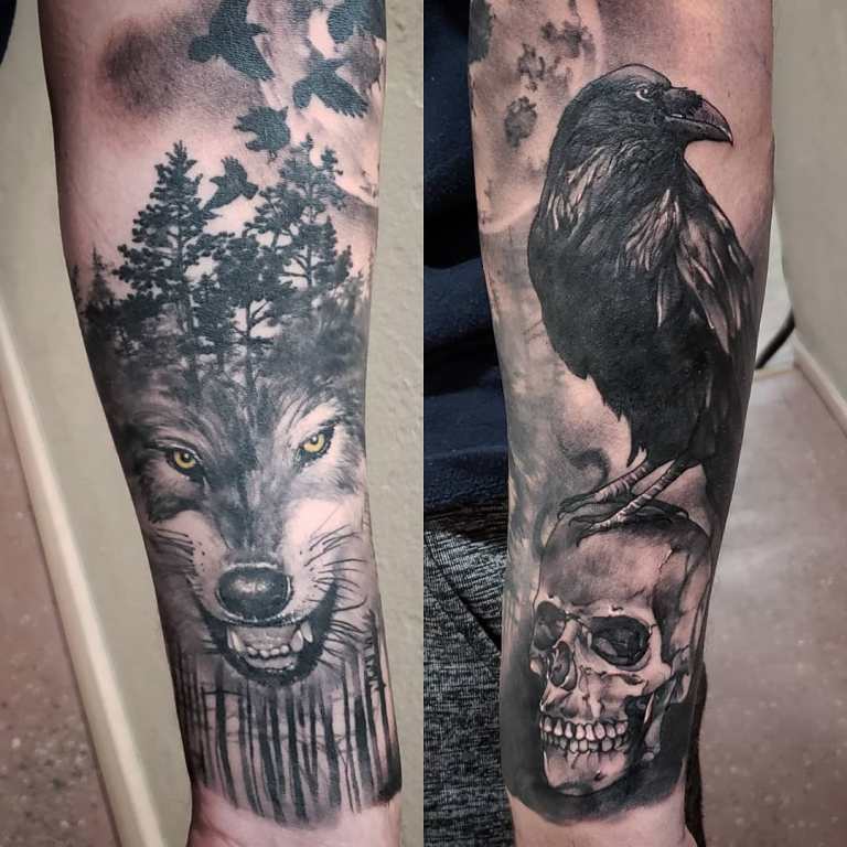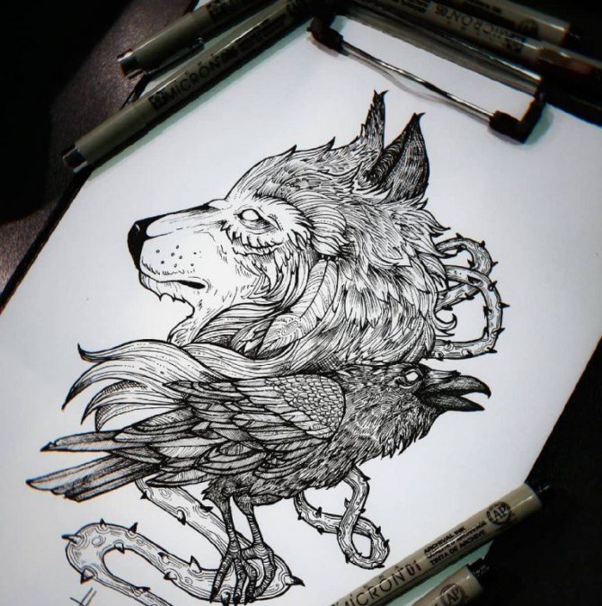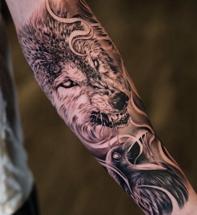 Η έννοια του τατουάζ κοράκι και λύκος - μοναξιά, σοφία, ανεξαρτησία. Ο ιδιοκτήτης ενός τέτοιου τατουάζ μπορεί να περιγραφεί ως ένα ισχυρό άτομο έτοιμο για τις πιο σκληρές δοκιμασίες της ζωής. Και η παρουσία του εσωτερικού πυρήνα και η αυτοπεποίθηση επιτρέπουν στους ανθρώπους να συσχετίζουν τους εαυτούς τους με τους λύκους.
