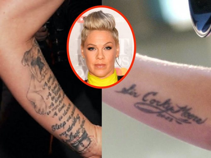 Στο αντιβράχιο του αριστερού της χεριού υπάρχει ένα πορτρέτο του αγαπημένου της μπουλντόγκ. Το όνομά του ήταν Elvis και πέθανε το 2007 ενώ οι Pink ήταν σε περιοδεία. Κάτω από το πορτρέτο του σκύλου υπάρχει μια βιβλική επιγραφή. Με λίγα λόγια, σημαίνει ότι η τραγουδίστρια αφήνει το κατοικίδιό της, παρόλο που το αγαπάει και της λείπει πολύ.