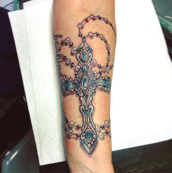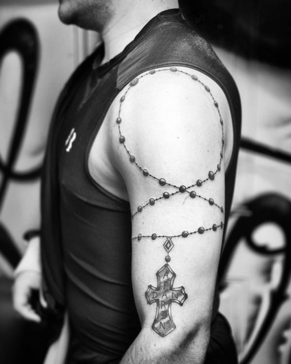 Αν και η εκκλησία δεν είναι ενθουσιασμένη με την τέχνη των τατουάζ, υπάρχουν ακόμα άνθρωποι στον εικοστό πρώτο αιώνα που εκφράζουν τη θρησκευτική και καλλιτεχνική τους ταυτότητα μέσω αυτής της δροσερής ανθρώπινης εφεύρεσης. Αυτός ο άντρας έχει ένα τεράστιο τατουάζ στον ώμο του με ένα ροζάριο που επικαλύπτεται και συστρέφεται. Σημαίνει να μη φοβάσαι να μείνεις σε οποιαδήποτε περίσταση.