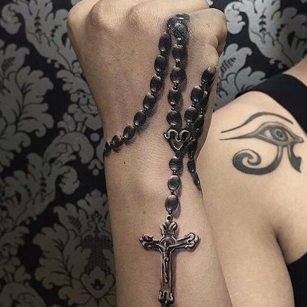 Αυτά τα δύο τατουάζ στο στήθος και στο εσωτερικό του αντιβραχίου απεικονίζουν τον πραγματικό σκοπό των χαντρών - να βοηθούν κατά τη διάρκεια της προσευχής. Οι χάντρες σφίγγονται σφιχτά ανάμεσα στα χέρια, μεταφέροντας τη μνήμη των προσευχών που έχουν ήδη ειπωθεί και θα εισακουστούν. Μια τέτοια εικόνα είναι ένα εκπληκτικό σημάδι ενός σύγχρονου ανθρώπου με ειλικρινή πίστη στον Θεό.