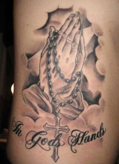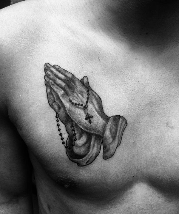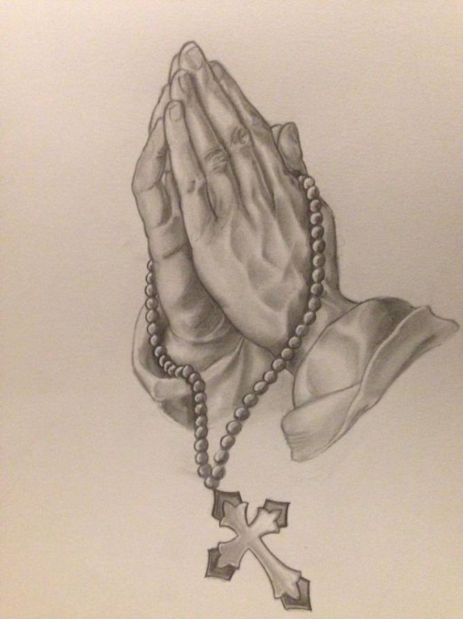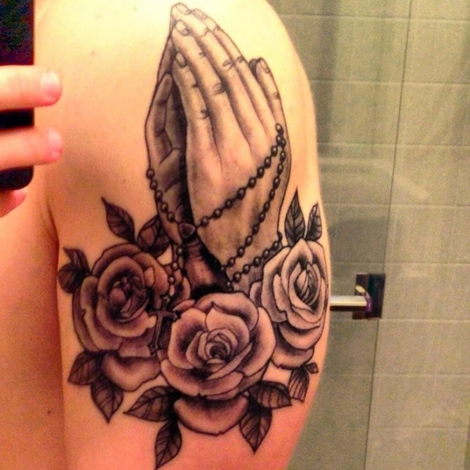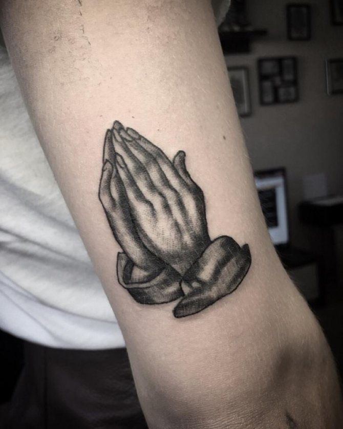 Συμβαίνει ότι σε αυτές τις τεχνικές, το τατουάζ του χεριού ενός προσευχόμενου άνδρα με έναν σταυρό φαίνεται καλύτερο. Αυτό το σύμβολο είναι εξίσου κατάλληλο για άνδρες και γυναίκες, μόνο που τα κορίτσια προτιμούν να εφαρμόζουν μικρότερο μέγεθος εικόνας. Η εικόνα συμπληρώνεται με χάντρες κομπολογιού, σταυρούς, αλυσίδα, ονόματα αγαπημένων προσώπων και φιλοσοφικές φράσεις.