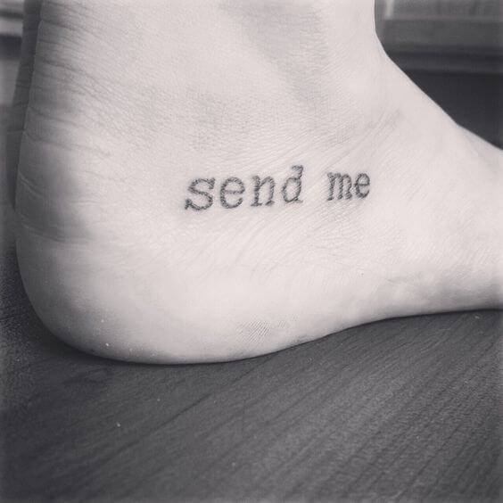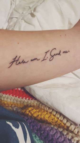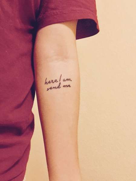 Και να 'μαι. Στείλτε το σε μένα. Αυτό το τατουάζ γραφής μπορεί να είναι ιδανικό για θρησκευτικούς ιεραποστόλους ή ανθρώπους που έχουν μια ευγενή υπεράσπιση ή αιτία να προωθήσουν. Αντανακλά την απόφαση που έλαβε ο προφήτης Ησαΐας, ο οποίος ξεκίνησε την προφητική του διακονία με αυτό το εδάφιο. Έτσι, για να εμπνεύσει τον κάτοχο του τατουάζ και να του υπενθυμίσει τη δια βίου αποστολή του, αυτό είναι ένα εξαιρετικό μέρος της Γραφής.