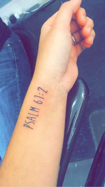 Ακριβώς πάνω από τον καρπό υπάρχει ένα τατουάζ με έναν στίχο της Βίβλου ως απλή υπενθύμιση. Το λεπτεπίλεπτο σχέδιο είναι όμορφο και πρέπει να αγαπηθεί. Με την επιγραφή ελαφρώς υπερυψωμένη πάνω από το δέρμα, το φρέσκο τατουάζ είναι ακριβώς η τέλεια υπενθύμιση στο χέρι μιας γυναίκας.