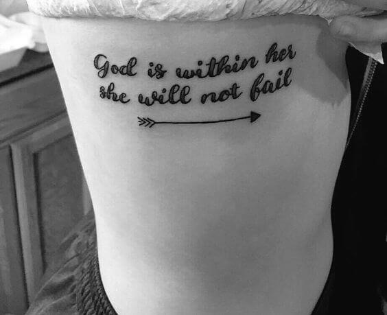 Ο Θεός είναι μέσα της, δεν θα αποτύχει. Για τις γυναίκες που περνούν μια δύσκολη περίοδο στη ζωή τους, είτε πρόκειται για διαζύγιο ή χωρισμό, είτε για θάνατο αγαπημένων προσώπων, είτε για απώλεια εργασίας, αυτό το τατουάζ με τις γραφές για γυναίκες μπορεί να τους αναζωπυρώσει την ελπίδα. Ή όταν προσπαθούν για το απίστευτο, αυτό είναι ενθαρρυντικό.