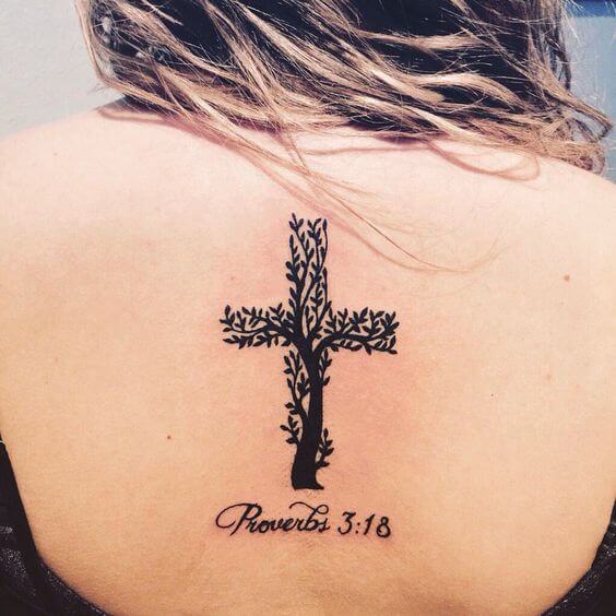 Ο καλλιτεχνικός σταυρός είναι ένα διάλειμμα από τους τυποποιημένους και πιο άκαμπτους σταυρούς που συναντάμε σε άλλα τατουάζ γραφής. Το μελάνι είναι από σκούρο σκληρό ξύλο σε σούπερ μοντέρνο σχέδιο σταυρού. Πρόκειται για μια μοναδική χρήση ενός διάσημου αποσπάσματος της Αγίας Γραφής.