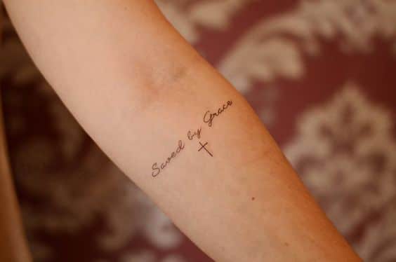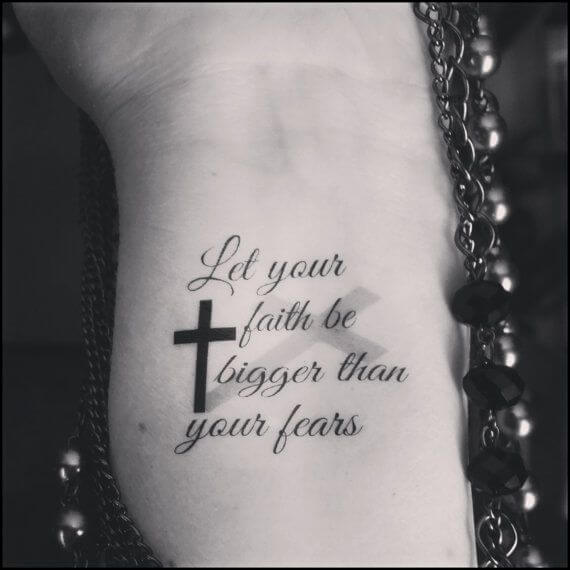 Ομαλές γραμμές και καμπύλες έχουν χρησιμοποιηθεί για να σχεδιαστούν οι λέξεις σε αυτό το εμπνευσμένο τατουάζ. Η προσθήκη του Σταυρού στα αριστερά και στο εσωτερικό κάνει το κομμάτι πιο γοητευτικό. Οι λέξεις εμφανίζονται ελαφρώς υπερυψωμένες με σκιά σταυρού στο φόντο.