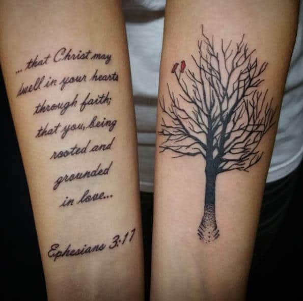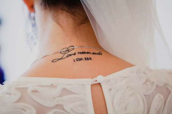 Αλλά η αγάπη θα διαρκέσει για πάντα! Αυτή η ιδέα ενός τατουάζ με τις γραφές είναι εξαιρετική, ειδικά πριν από την είσοδο στο δεσμό του γάμου. Θα τους θυμίζει για πάντα τι συνδέει το ζευγάρι και τι θα τους επιτρέψει να αντέξουν όλες τις δοκιμασίες και τις θλίψεις για να προστατεύσουν την ιερότητα του γάμου τους.