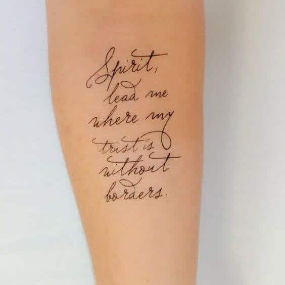 Στο χέρι μιας γυναίκας, μια πανέμορφη φράση είναι χαραγμένη σε κάθετο μοτίβο. Προσέξτε το παλιομοδίτικο σχέδιο αχνής γραμματοσειράς που χρησιμοποίησε ο καλλιτέχνης. Οι μεντεσέδες και οι καμάρες αποτελούν μέρος του σχεδίου, σχηματίζοντας όμορφα μοτίβα σε αυτό το σενάριο που μιλούν για εμπιστοσύνη.