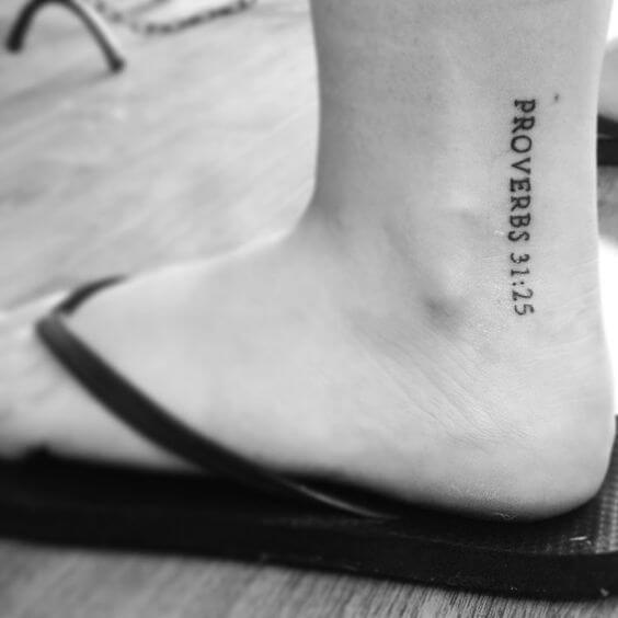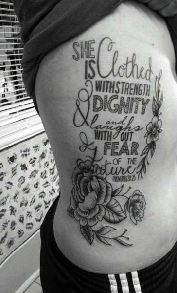 Παροιμίες 31: 25-26. Για έναν αξιαγάπητο, πιστό και υπεύθυνο σύζυγο, αυτή είναι μια υπέροχη ιδέα τατουάζ για γυναίκες και θα μπορούσε να αποτελέσει μια μεγάλη έκπληξη για τη Γιορτή της Μητέρας. Ενοχλεί τη σύζυγο και εξυψώνει τον ευγενή χαρακτήρα της. Σημαίνει επίσης ότι η ίδια και το μέλλον της οικογένειας είναι απολύτως ασφαλείς και φροντίζει σωστά τον σύζυγό της.