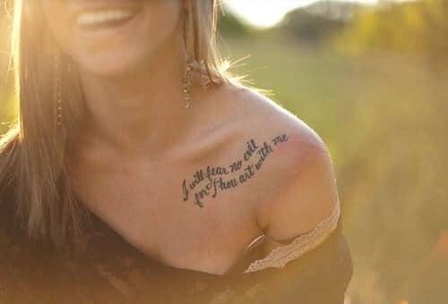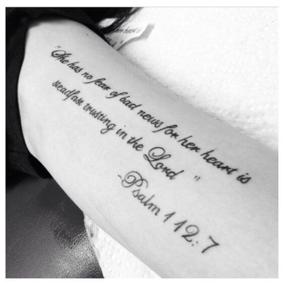 Σίγουρα ένα τατουάζ με απόσπασμα από τις γραφές που πρέπει να σκεφτείτε. Η πανέμορφη πρόταση είναι γραμμένη με μελάνι σε δύο επικαλυπτόμενες γραμμές. Αυτό το μέρος του σώματος είναι κατάλληλο για μακρόστενα γράμματα με μελάνι που έχουν περίπλοκες μπούκλες και είναι φτιαγμένα με κάποιες θηλιές.