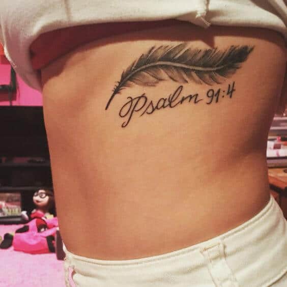 Ένα σκούρο τατουάζ με στυλό που έρχεται σε αντίθεση με τις ανοιχτόχρωμες γυναίκες. Είναι απλό αλλά όμορφο, και το αποτέλεσμά του είναι να το αγαπάς. Οι λεπτές πινελιές του στυλό και η δροσερή γραφή του "Ψαλμός 91:4" αρχίζουν να μοιάζουν με τατουάζ που εφαρμόζεται καλύτερα στο πλευρό.