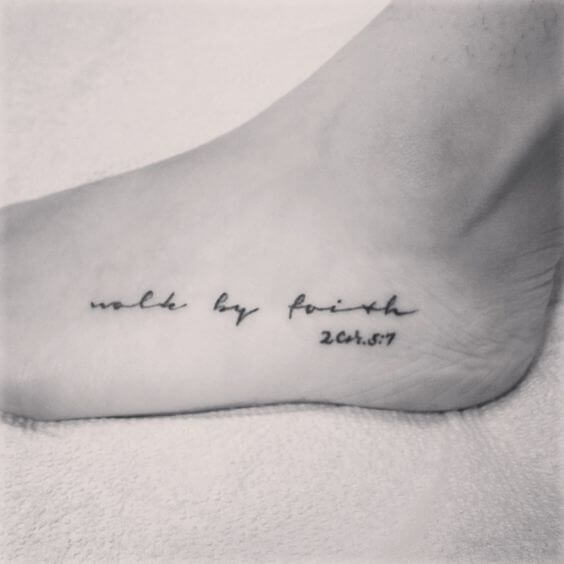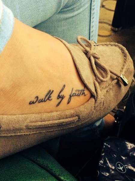 Περπατήστε με πίστη. Υπάρχουν στιγμές στην πορεία σας που αισθάνεστε απελπισμένοι και ηττημένοι. Αλλά όταν κοιτάξετε κάτω, θα δείτε αυτό το τατουάζ. Τότε θα αποκτήσετε νέα δύναμη και κίνητρα για να συνεχίσετε την προσπάθειά σας. Η τοποθέτησή του στα πόδια σας είναι μια ιδέα για τατουάζ που μπορεί άθελά σας να εμπνεύσει άλλους πριν το συνειδητοποιήσετε.