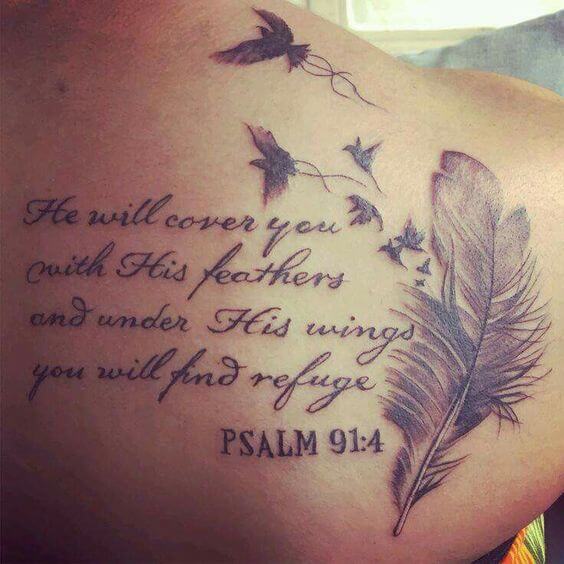 Τι γοητευτικό τατουάζ που είναι τόσο κοριτσίστικο όσο και ανεβαστικό. Το φτερό σε αυτό το κομμάτι πρέπει να είναι το αγαπημένο μου, μαζί με την ενσωμάτωση των πουλιών. Σκόπιμα φτιαγμένο ώστε να σχετίζεται με το εδάφιο, παρουσιάζει μια ιδιόρρυθμη αλλά και ουσιαστική ιδέα ενός τατουάζ της Αγίας Γραφής.