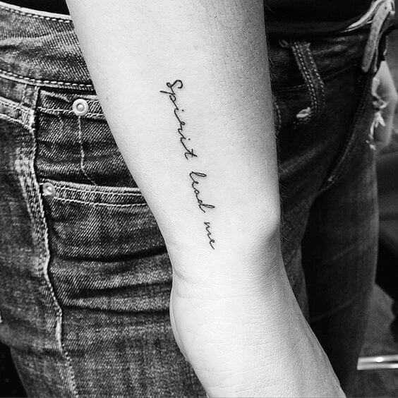 Η χριστιανική φράση στο θρησκευτικό σχέδιο τατουάζ αποτελείται από δύο μόνο γραμμές. Ο σχεδιασμός είναι μινιμαλιστικός και έχει παραδοσιακή γραφή. Παρατηρήστε αυτές τις γραμμές που τοποθετούνται στο εσωτερικό του βραχίονα, στέλνοντας ένα ισχυρό μήνυμα από τη γυναίκα που επιλέγει να τις βάψει.
