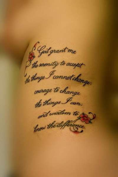 Αυτός ο όμορφος στίχος είναι σχεδόν εξίσου υπέροχος με τα λουλούδια που τον συνοδεύουν. Για να μην αναφέρουμε τη στενογραφία του κειμένου. Το τσίμπημα δύο κόκκινων λουλουδιών το κάνει να έχει επιτυχία στις θρησκευόμενες γυναίκες. Το τατουάζ είναι απλά εκπληκτικό.