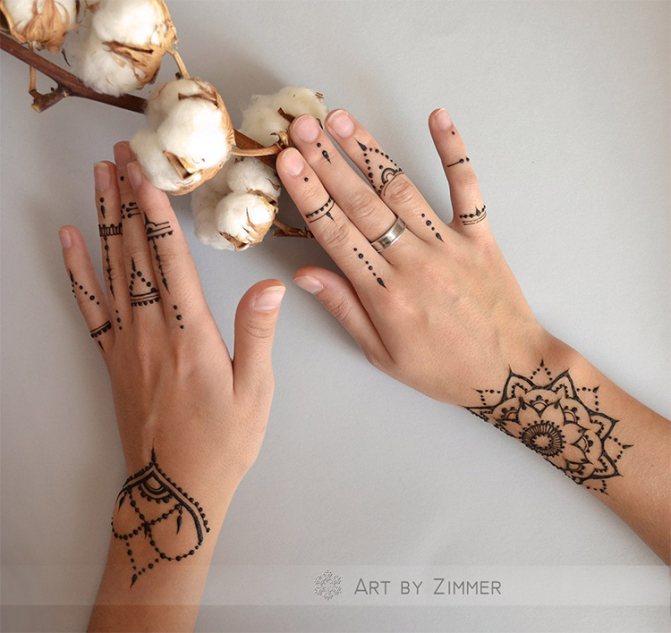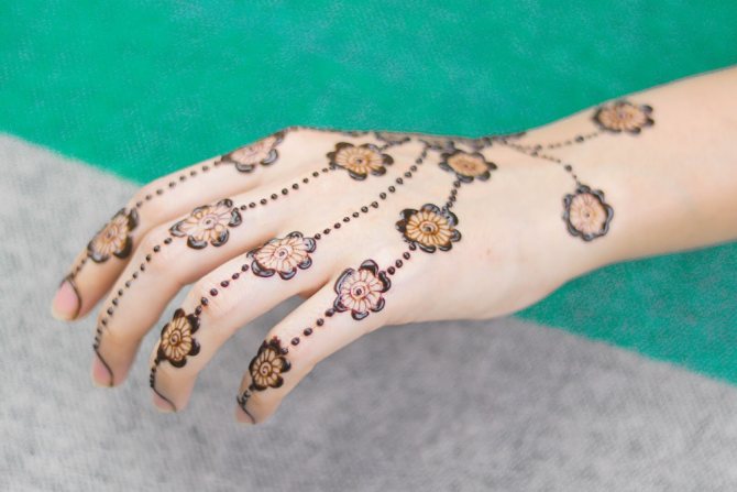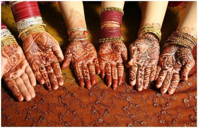- floral σχέδια και στολίδια και εικόνες ινδικών θεοτήτων. Πυκνό μοτίβο με μικρές λεπτομέρειες, καλύπτει όλη την επιφάνεια των χεριών και των ποδιών, δημιουργώντας ένα εφέ κάλτσας και γαντιού. - Ασιατικό