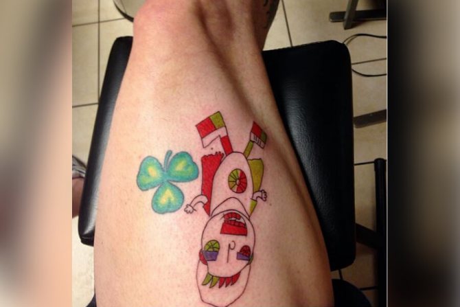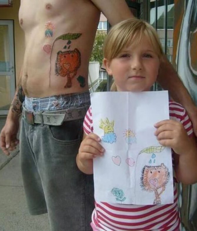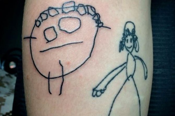 Ο μπαμπάς ήταν αυτός που αποφάσισε να διατηρήσει την πρώτη ζωγραφιά του παιδιού του για μια ζωή και έκανε τατουάζ. Στα δεξιά, μπορείτε να δείτε μια αναμφισβήτητη ομοιότητα πορτρέτου με τη μαμά - μακριά μαλλιά, ένα ευγενικό χαμόγελο, χαριτωμένες κινήσεις και ακόμη και ένα φανταχτερό καπέλο. Στα αριστερά, ένα γιγάντιο κεφάλι με μάτια διαφόρων μεγεθών απεικονίζει πιθανότατα τον μπαμπά. Αν υποθέσουμε ότι τα πόδια κάτω δεν απεικονίζονται, αλλά δύο τρίχες από το μούσι που ο μπαμπάς αφήνει ανεπιτυχώς, η ομοιότητα γίνεται πιο εμφανής.