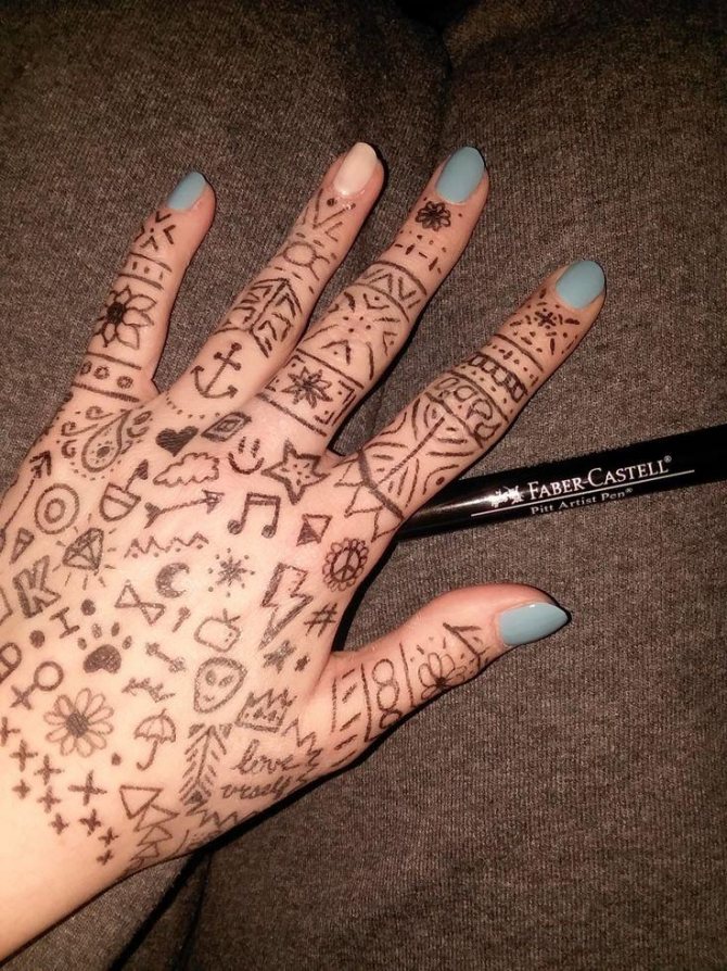 - Όταν σχεδιάζετε ένα τατουάζ με το χέρι στο πρώτο στάδιο, είναι προτιμότερο να χρησιμοποιείτε μικρά, απλά γεωμετρικά περιγράμματα, καθώς τα περίπλοκα σχέδια λερώνονται εύκολα.