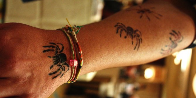 Επίσης, ένα καλό μέρος για να εφαρμόσετε το τατουάζ είναι η κλείδα, το αντιβράχιο, τα δάχτυλα, τα πόδια, και τα κορίτσια θέλουν επίσης να εφαρμόσουν μια φωτεινή εικόνα στο πρόσωπό του.